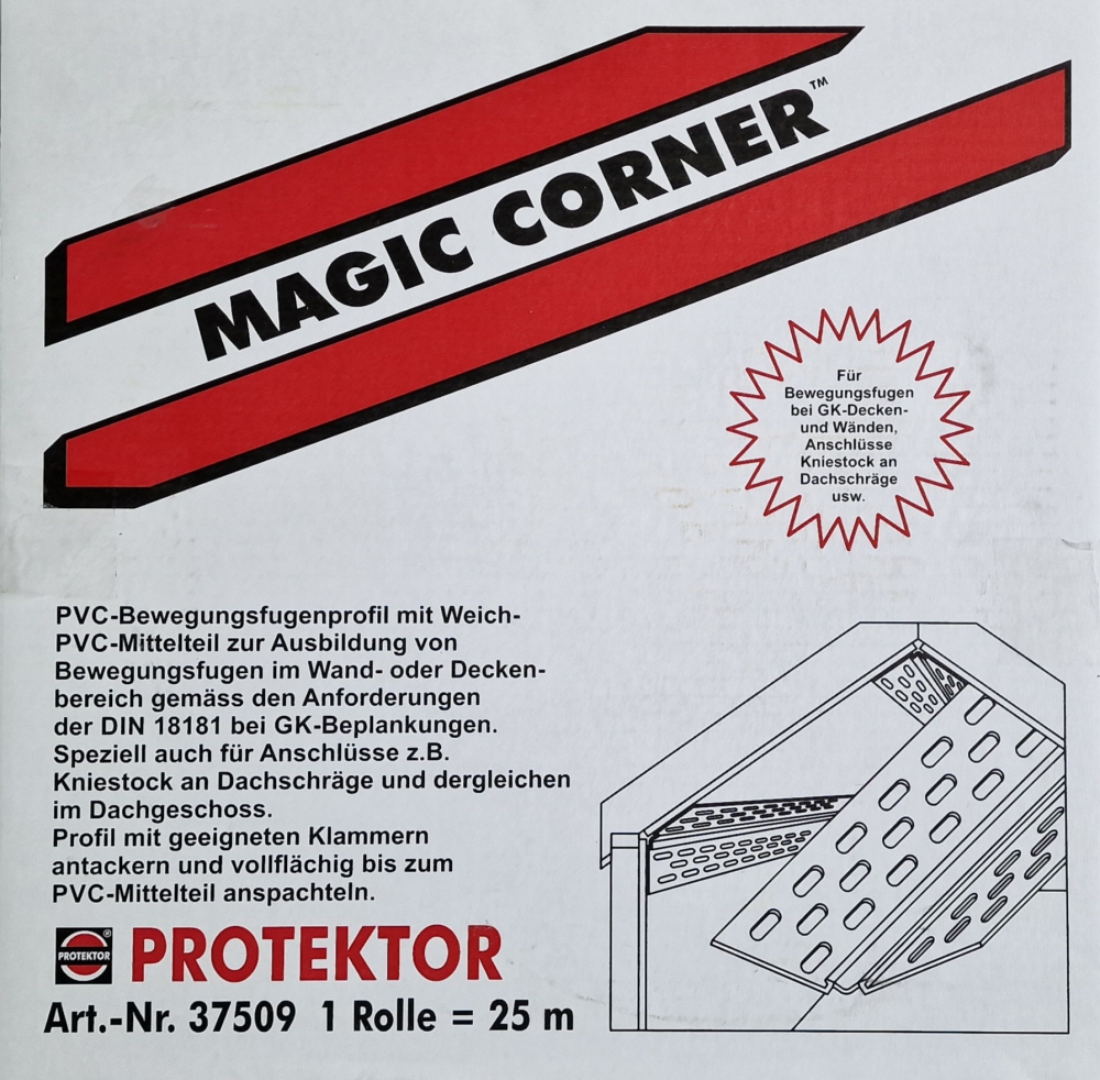 Magic Corner je speciální profil určený do namáhaných šikmin, schopný bezpečně vyrovnat případné rozdíly do 4 mm, vhodný do vnitřích i vnějších rohů interiéru. Jeho instalace zabraňuje popraskání rohů.